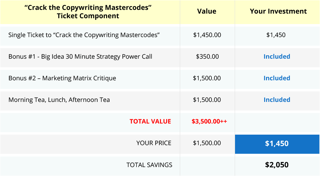 A priceless resource ONLY available to attendees of Crack the Copywriting Mastercodes! You can’t buy this anywhere… you’ll refer to it again and again long after the event as you craft your winning sales messages.