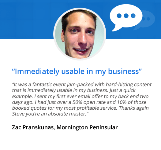 “I took what you taught me in 2 days and helped my mate Shane, the state master franchisor in the home services niche, explode his business. We were able to double the number of franchisee inquiries AND double the number of conversions into franchisees.”